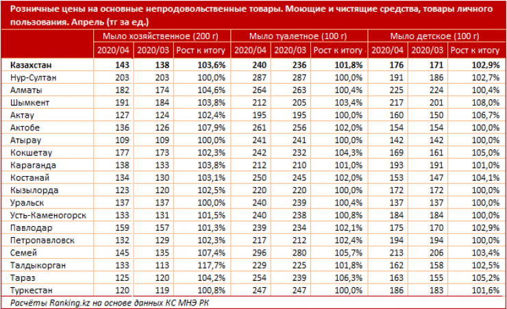Хозяйственное мыло выросло в цене за апрель на 3,6 процента в среднем по Казахстану. При этом самое заметное подорожание отмечено в Талдыкоргане - сразу на 17,7 процента.