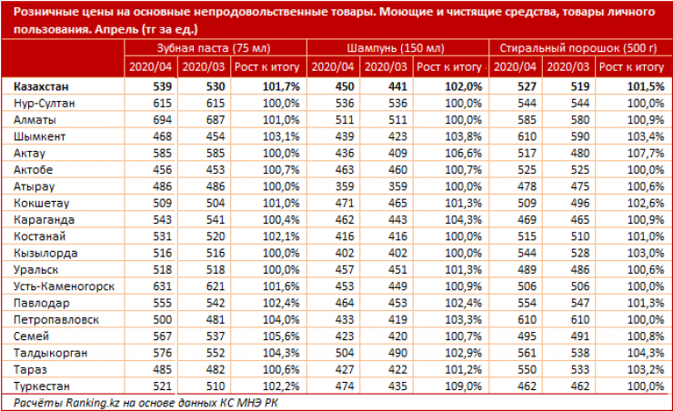 Сообщается также, что за апрель цены на эти товары выросли в среднем по Казахстану на 1,5–3,6 процента.