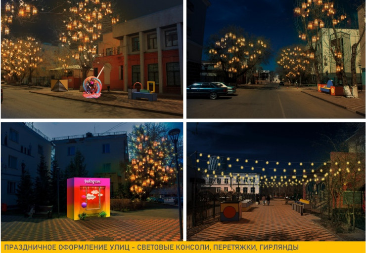 Также предусмотрели и оформление в ночное время - световые консоли, перетяжки, гирлянды. Для комфортности вечерних прогулок проведут фасадное освещение. Фасады некоторых домов украсят граффити. Будут установлены и конструкции для граффити-фестивалей.