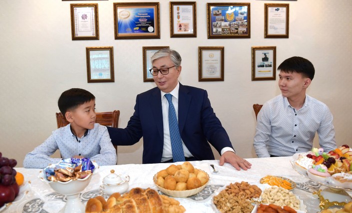 Глава государства посетил дом, где проживает семья героя. Президенту Казахстана показали мемориальную доску, установленную в честь Газиза Байтасова, его фотографии, медали и личные вещи.