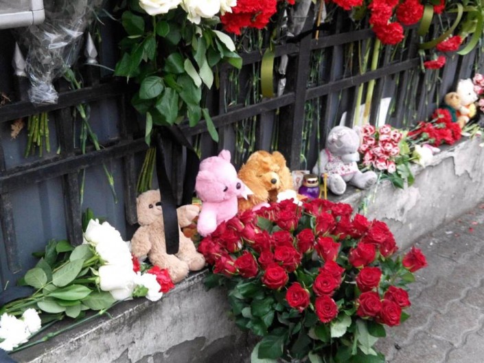 Митинг скорби у здания консульства прошел 28 марта 2018 года. Игрушки и цветы были принесены алматинцами в память о погибших при пожаре в торговом центре "Зимняя вишня" в Кемерово.