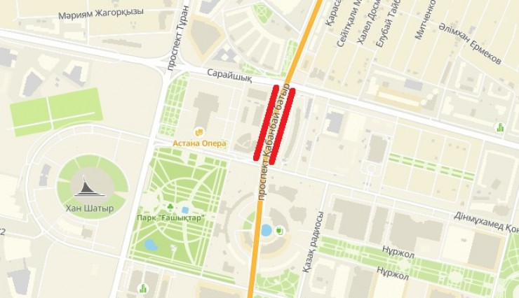 С 20 по 22 августа будет полностью перекрыто движение на участке проспекта Кабанбай батыра от улицы Сарайшык до улицы Конаева.