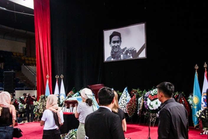 Говорит министр культуры и спорта Арыстанбек Мухамедиулы. Он зачитывает телеграмму от имени Нурсултана Назарбаева, которая ранее была передана родителям Дениса. Телеграмму от имени акима Алматы Бауыржана Байбека зачитывает его заместитель.