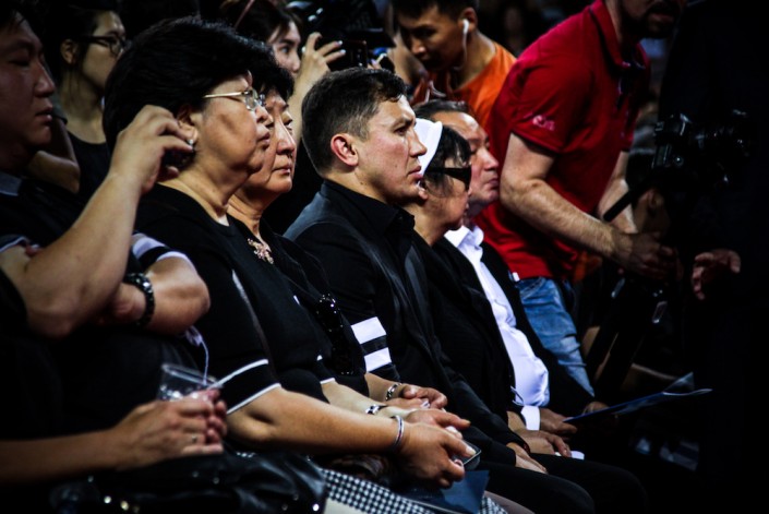 Напротив сидят родные, близкие и друзья фигуриста. Женщины - в белых платках. Маму спортсмена - Оксану Тен поддерживает боксер Геннадий Головкин. Когда объявили, что он, друг Дениса, специально прервал подготовку к бою в США и прилетел в Казахстан, зал начал аплодировать.