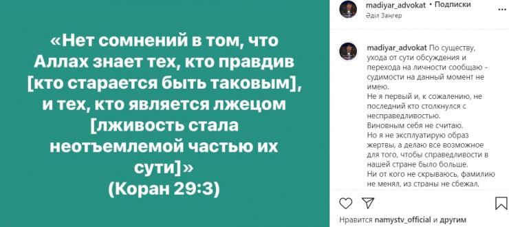 Позже 44-летний Мадияр Альжаппаров в Instagram прокомментировал историю о своем прошлом. По словам юриста, на данный момент он не имеет судимости и не считает себя виновным в этом преступлении.