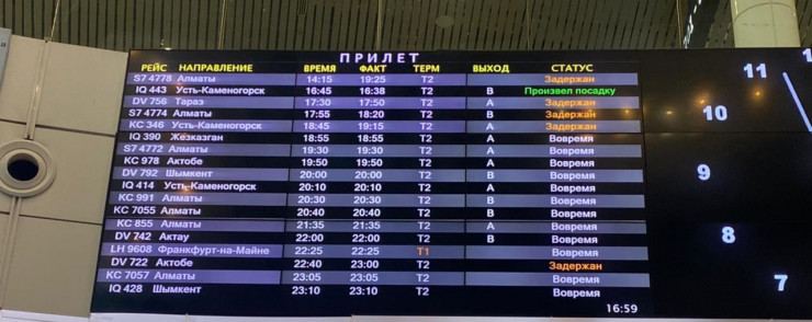 Судя по онлайн-табло столичного аэропорта, задерживаются рейсы из Тараза, Алматы, Усть-Каменогорска и Актобе.