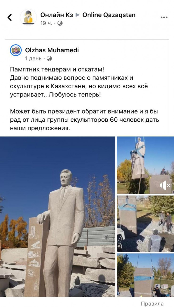 Может быть, Президент обратит внимание. И я бы рад от лица группы скульпторов в 60 человек дать наши предложения", - написал Олжас.