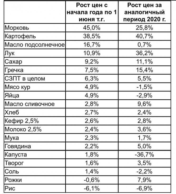 По информации ведомства, с начала текущего года среди всех товаров больше всего подорожали: морковь - на 45,0 процента, картофель - на 38,5 процента, масло подсолнечное - на 16,7 процента, лук - на 10,9 процента, сахар - на 9,2 процента, крупа гречневая - на 7,5 процента.