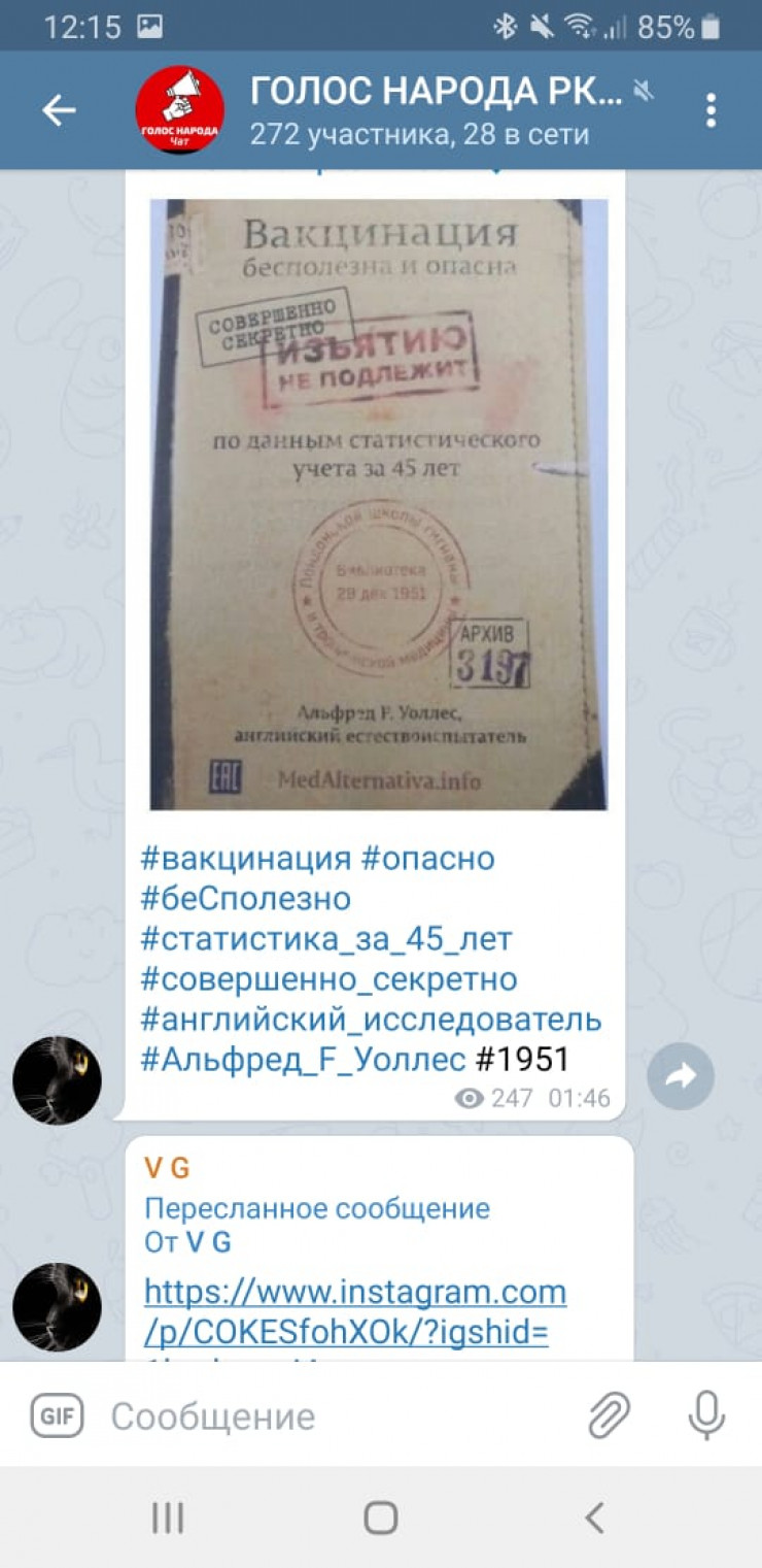 Казахстанцы в Telegram-чатах распространяют фотографию обложки книги с названием "Вакцинация бесполезна и опасна", написанной Альфредом Уоллесом. Обложка покрыта печатями "совершенно секретно" и "изъятию не подлежит". Специалисты Stopfake.kz заверяют: это манипуляция, передает Tengrinews.kz.