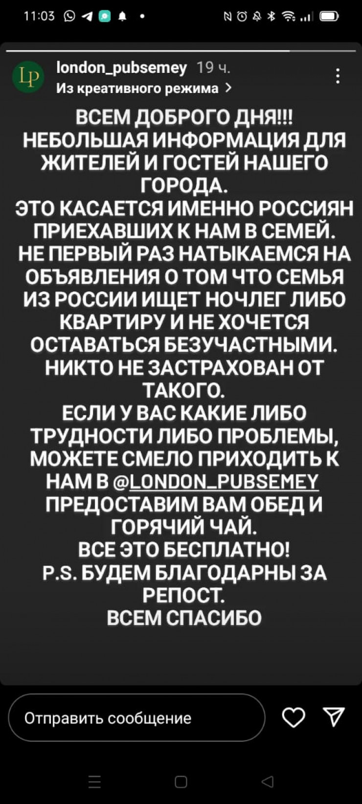 На странице в социальных сетях одного из пабов Семея предлагают бесплатный обед и горячий чай для россиян, оказавшихся в беде, передает корреспондент Tengrinews.kz.
