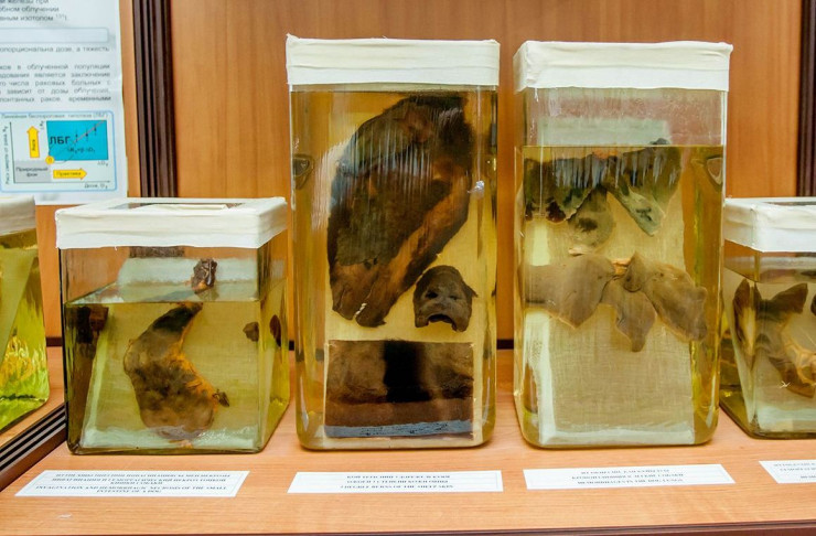 Здесь же – заспиртованные фрагменты обожженных тел подопытных животных, которых сгоняли на полигон во время испытаний.