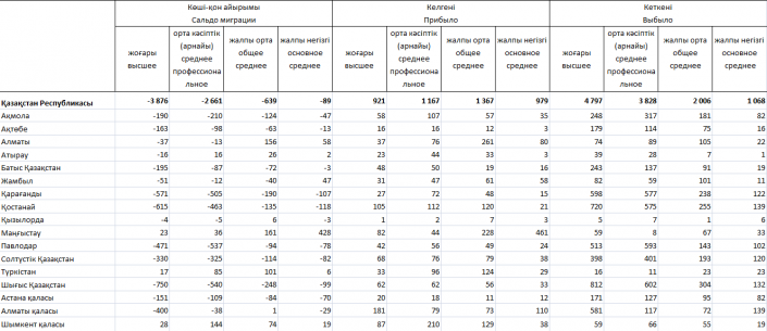 В разрезе имеющегося образования из 15 399 уехавших в страны СНГ казахстанцев старше 16 лет у 4 797 есть высшее образование, 3 828 человек имеют среднее профессиональное образование, 2 006 человек - общее среднее образование, 1 068 - основное среднее образование.