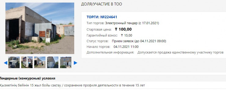 Торги по продаже предприятия пройдут 4 ноября. На балансе ТОО "Мамлютское 1" здания, автомобили, бытовая техника. Все это было оценено всего в один тенге по причине имеющегося долга. Стартовая цена предприятия на аукционе составит всего 100 тенге.