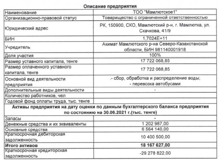 Одно из госпредприятий в городе Мамлютка Северо-Казахстанской области, занимающееся благоустройством, оценили всего в один тенге. Теперь ТОО "Мамлютское 1", учредителем которого является акимат Мамлютского района, продадут с аукциона в частные руки. Об этом стало известно порталу Петропавловск.news, сообщает Tengrinews.kz.
