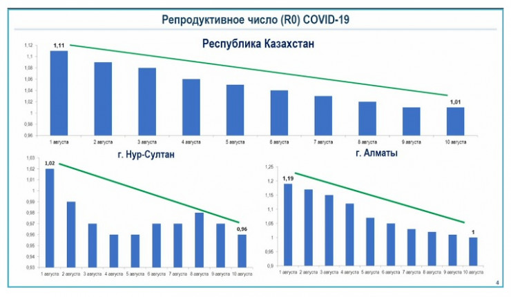 По его словам, с 1 августа индекс распространенности COVID-19 в Казахстане снижен на 9 процентов - с 1,11 до 1,01. В Нур-Султане показатель составил ниже единицы, в Алматы число R снижено на 19 процентов.