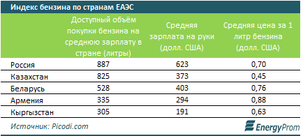 Согласно рейтингу, в Казахстане на среднестатистическую зарплату можно купить 825 литров бензина. Среди стран Евразийского экономического союза показатель выше только в России - 887 литров. Тем временем в Беларуси на среднестатистическую зарплату можно купить 528 литров бензина, а в Армении и Кыргызстане - всего 335 и 305 литров, соответственно. При этом бензин в Казахстане стоит дешевле по сравнению с союзниками по ЕАЭС.