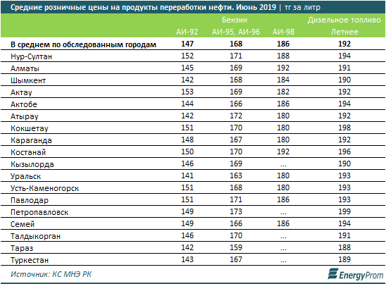 По данным Министерства национальной экономики, в июне в среднем по городам Казахстана цена на бензин марки АИ-92 составила 146,8 тенге за литр, снизившись на 6,8 процента по сравнению с аналогичным периодом прошлого года (157,4 тенге за литр). Тем временем стоимость АИ-95/96 составила 168,4 тенге за литр, за год цена снизилась на 4,1 процента, а цена бензина марки АИ-98 составила 185,6 тенге, при снижении на 3,7 процента за год.