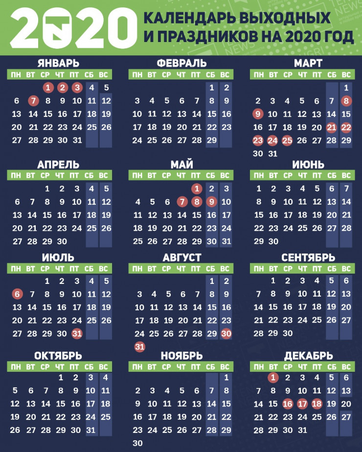 Больше всего отдыха приходится на март и май 2020 года - в эти месяцы будет всего по 18 рабочих дней и по 13 выходных. Самый "трудовой" месяц - октябрь с 23 рабочими днями.