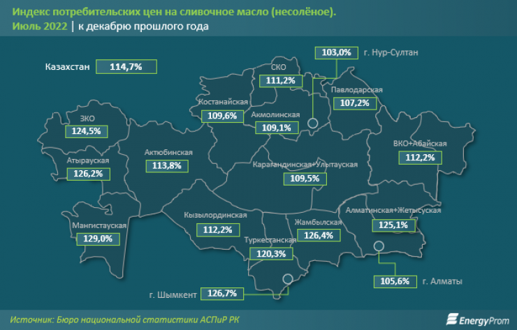 С начала года сливочное масло заметнее всего подорожало в Мангистауской области - сразу на 29 процентов. Следом идут Шымкент и Жамбылская область, где подорожание составило 26,7 и 26,4 процента соответственно.