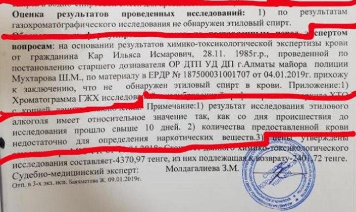 "Экспертиза не подтвердила наличие алкоголя в крови водителя. Кровь была изъята 30 декабря 2018 года, но направлена в лабораторию только 4 января 2019 года. Результат экспертизы получен 11 января, то есть экспертизу проводили более десяти дней. Кроме того, невозможно было осуществить наркоэкспертизу. Как оказалось, крови для исследования было предоставлено недостаточно. Почему опытный следователь допустил забор малого количества крови и при приеме материала специалисты лаборатории сразу не указали на данный факт? Неужели подобная экспертиза проводится впервые?" - говорит Айдана Шаяхметова.