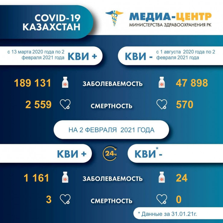 За прошедшие сутки (по данным на 1 февраля) в Казахстане зарегистрирован 1 161 новый случай заболевания коронавирусной инфекцией, сообщает Tengrinews.kz со ссылкой МВК по нераспространению COVID-19.