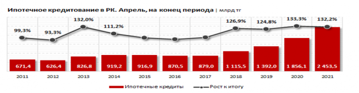 По данным Национального банка, объем ипотечного кредитования за последние 10 лет вырос в 3,7 раза. Однако динамика роста не является однородной. Если с 2011 по 2013 год объем ипотечного кредитования увеличивался (на 37 процентов), то с 2014 по 2017 год наблюдалось незначительное снижение спроса. Наибольший рост объемов ипотеки - в 2,8 раза - произошел в 2017-2021 годах: с 879 до 2 453 миллиардов тенге.