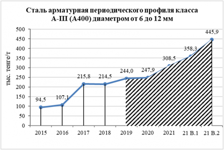 Специалисты КазНИИСА отследили динамику цен на стальную арматуру за 2015-2021 годы. За данный период удорожание произошло более чем в четыре раза. Наибольший рост цен на данный материал опять же произошел за последние семь месяцев. С декабря 2020 года по май 2021 года арматура подорожала более чем в два раза. Основной причиной роста является резкий рост цен на стальной прокат на мировых рынках, прежде всего в Китае, США, ЕС.