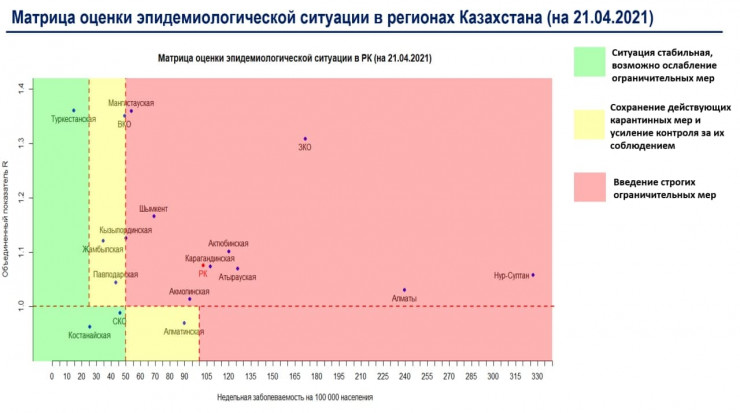 Сообщается, что в "красной" зоне сегодня находятся Нур-Султан, Алматы, Шымкент и Акмолинская, Атырауская, Актюбинская, Западно-Казахстанская, Карагандинская, Кызылординская, Мангистауская области.