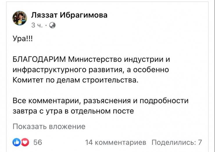 "Ура!!! БЛАГОДАРИМ Министерство индустрии и инфраструктурного развития, а особенно Комитет по делам строительства. Все комментарии, разъяснения и подробности завтра с утра в отдельном посте", - написала она в своем Facebook.