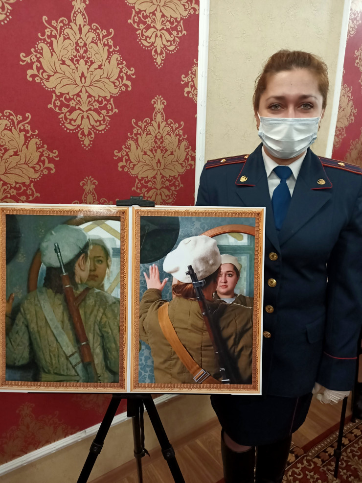 "Я выбрала картину мексиканского художника Хесуса Эльгеры. Он в основном рисовал портреты своей супруги. Она была его моделью. Здесь мы внешне не очень похожи, но сходство больше отражается в мелочах. На самом деле это довольно тяжело - в точности кого-то скопировать, потому что у каждого свои черты лица, но было интересно", - рассказала инспектор-психолог батальона дорожно-патрульной полиции Екатерина Буданова.