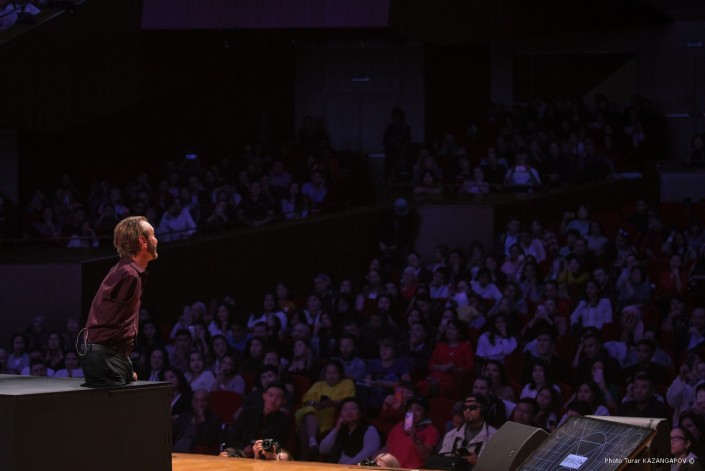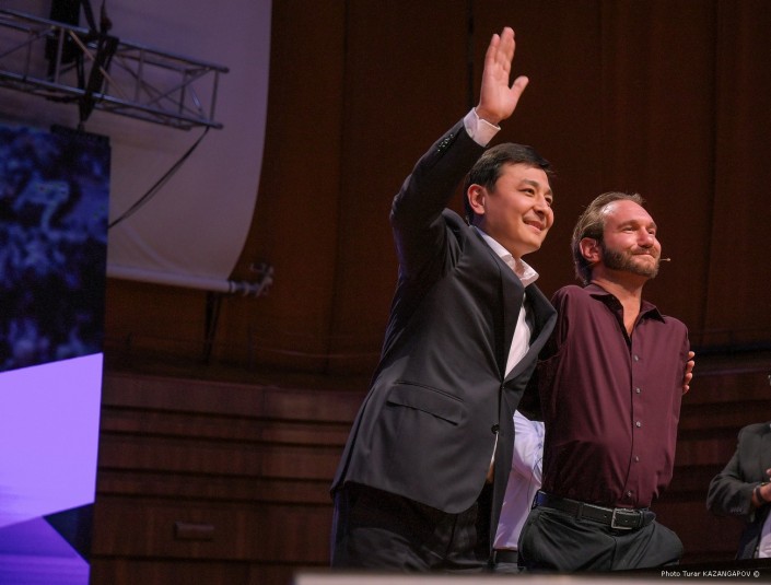 После выступления на сцену к Нику Вуйчичу поднялся аким Нур-Султана Алтай Кульгинов.
