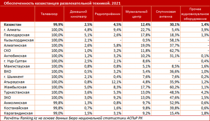 Музыкальные центры, видеокамеры, фотоаппараты, ноутбуки и планшеты чаще всего имелись в наличии у семей в Алматы, спутниковые антенны - у жителей Северо-Казахстанской области.
