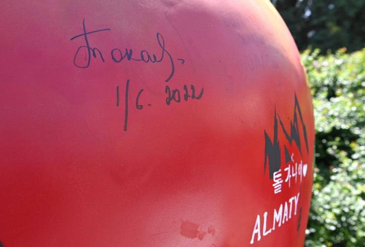 "Касым-Жомарт Токаев оставил автограф на символе Алматы - экспозиции, сделанной в форме яблока", - говорится в сообщении пресс-службы Президента в Telegram-канале "Борт N1".