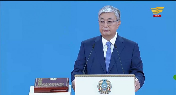 "Торжественно клянусь верно служить народу Казахстана, строго следовать Конституции и законам Республики Казахстан, гарантировать права и свободы граждан, добросовестно выполнять возложенные на меня высокие обязанности Президента Республики Казахстан".
