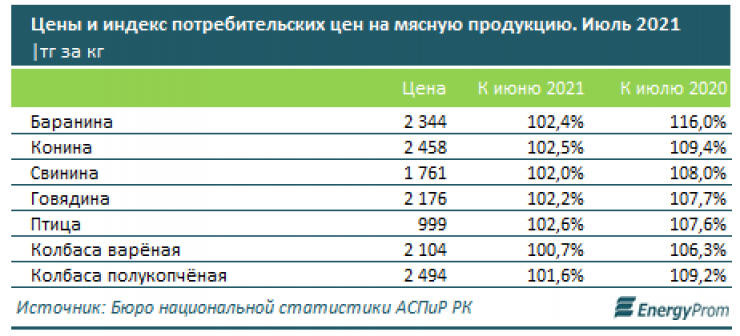 Цена на мясную продукцию по итогам июля в стране увеличилась на 2,1 процента, передает корреспондент Tengrinews.kz со ссылкой на данные мониторингового агентства Energyprom.kz.