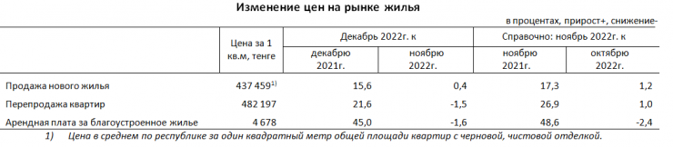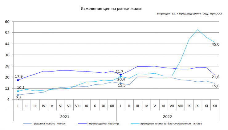 За год (декабрь 2022 года к декабрю 2021 года) цены на квартиры вторичного рынка повысились на 21,6 процента, новое жилье – на 15,6 процента. Арендная плата за благоустроенное жилье в декабре 2022 года по сравнению с аналогичным месяцем предыдущего года повысилась на 45 процентов.