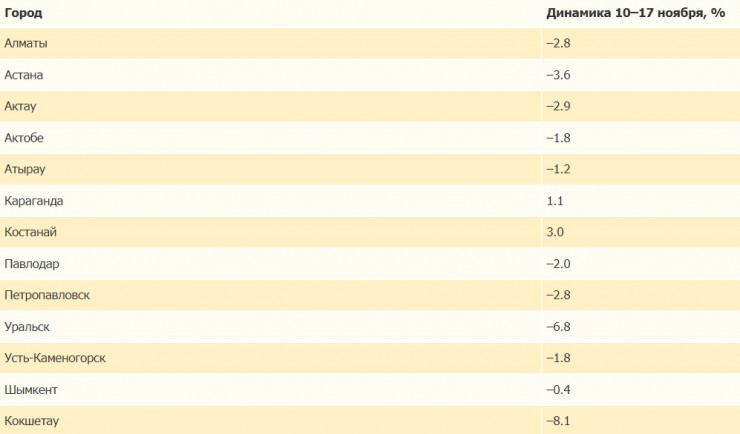Максимальное снижение за период произошло в Кокшетау (-8,1 процента), Уральске (-6,8 процента), Астане (-3,6 процента).