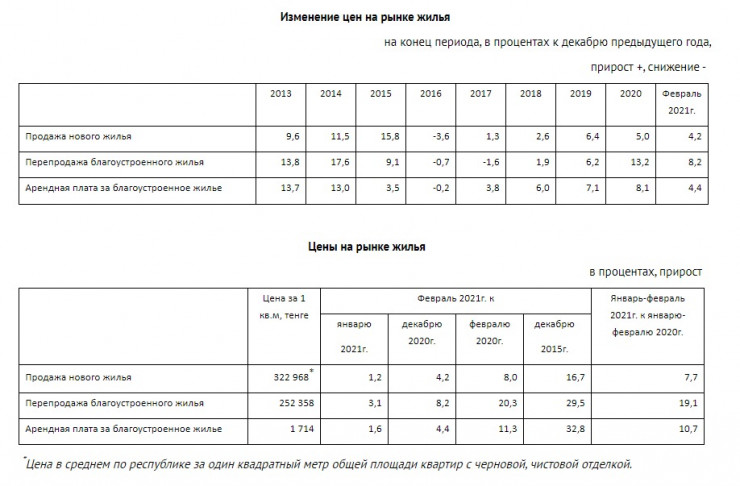 Цены на февраль 2021 года к февралю 2020 года повысились на 8 процентов на первичном рынке жилья и на 20,3 процента - на вторичном рынке.