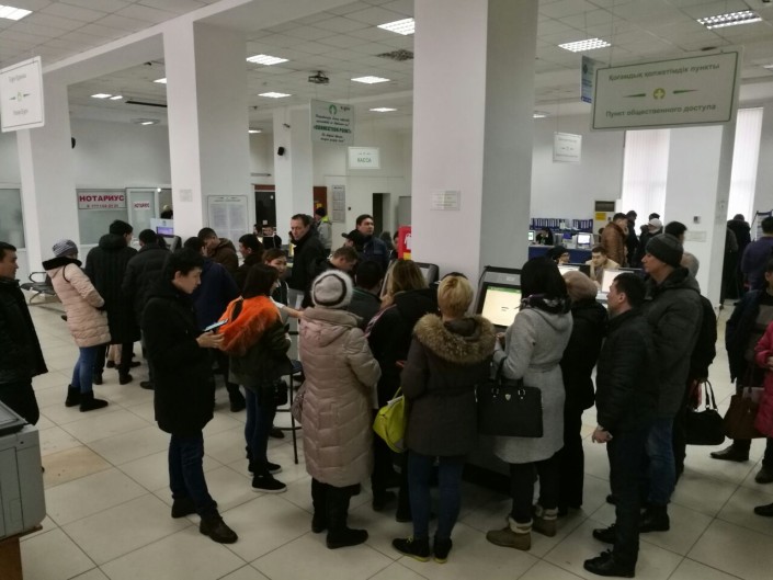 Люди стоят в очередях перед терминалами, которые выдают адресные справки. Также очереди наблюдаются в справочную, где выдают талоны на услуги.