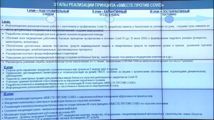 Реализация принципа "вместе против COVID-19" предполагает три последовательных этапа. Подготовительный - две недели, карантинный (от двух до четырех недель) и переход к полноценной реализации принципов "вместе против COVID-19".