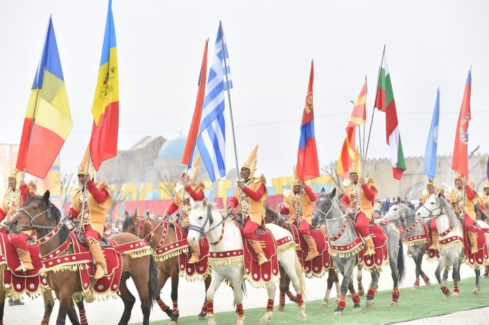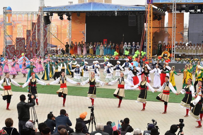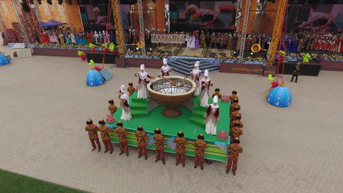 На сцене в это время развернулось театральное представление. Актеры были в образах Арыстан баба, Яссауи, аль-Фараби, Коркыт Ата, казахских ханов, а около 500 танцоров удивили всех масштабной хореографической постановкой. Кроме того, по площади прошел караван "Наурыз" из 18 верблюдов и 30 лошадей. Затем в присутствии тысяч человек малышу из Туркестана провели обряд тусаукесу. Путы перерезали аким ЮКО Жансеит Туймебаев и министр культуры и спорта Арыстанбек Мухамедиулы.