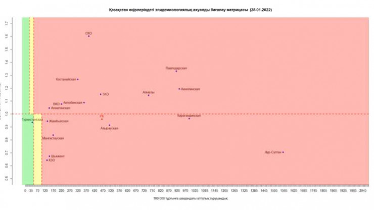 - "красной" зоне находятся Нур-Султан, Алматы, Шымкент, Атырауская, Алматинская, Акмолинская, Актюбинская, Восточно-Казахстанская, Западно-Казахстанская, Жамбылская, Мангистауская, Карагандинская, Кызылординская, Костанайская, Павлодарская, Северо-Казахстанская области;