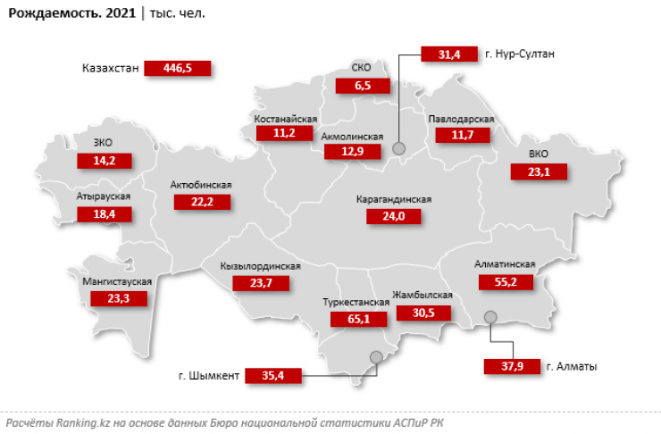 В 2021 году больше всего новорожденных среди регионов страны зарегистрировали в Туркестанской области - 65,1 тысячи младенцев за год и плюс 6,2 процента в сравнении с прошлым годом. Среди лидеров также Алматинская область - 55,2 тысячи детей и Алматы - 37,9 тысячи новорожденных.