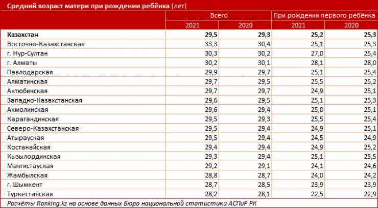 Среди регионов самые молодые матери жили в Туркестанской области: средний возраст при рождении первенца составил 22,5 года. На втором месте в этом рейтинге оказался Шымкент - 23,9 года, на третьем - Жамбылская область (24 года). Не торопятся с рождением первого ребенка жительницы Алматы (28,1 года), а также Нур-Султана и Алматинской области.