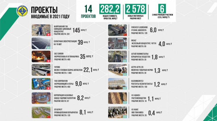 Из ближайших запусков: весной - обогатительная фабрика в Жайреме, ферросплавный завод и агломерационная фабрика Qaz Carbon. Второе дыхание обретает бывший завод РТИ в Сарани спустя 15 лет простоя. На его площадке уже заработало предприятие по производству автобусов и спецтехники с участием китайской компании Yutong и в ближайшее время будет запуск мелкоузловой сборки. А также в этом году начнется строительство завода по производству шин с участием российской компании "Татнефть".