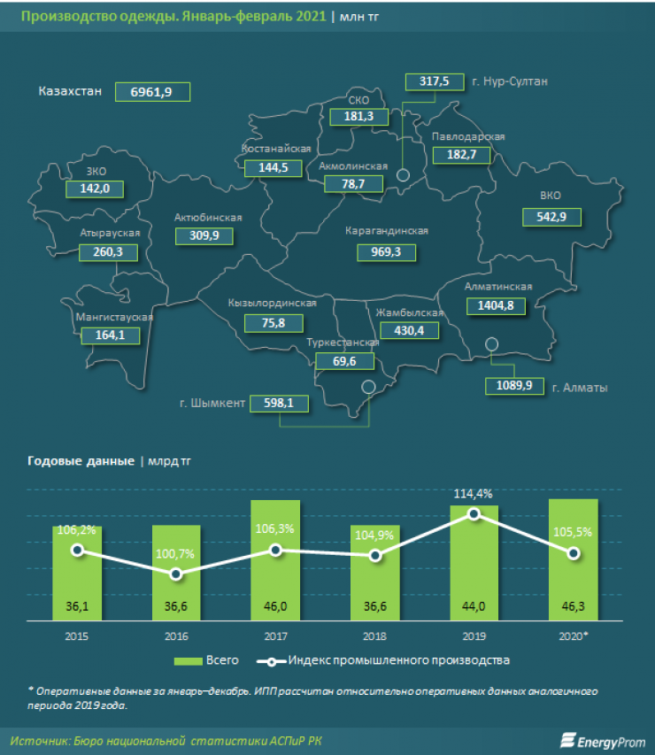 За январь-февраль 2021 года компании страны произвели одежды на семь миллиардов тенге. Это на 24,1 процента больше, чем годом ранее. В региональном разрезе наибольший объем выпуска пришелся на Алматинскую область. В тройку лидеров также вошли Алматы и Карагандинская область.