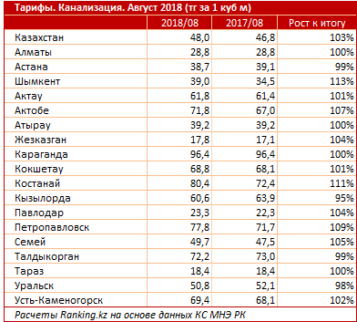 Услуги по отводу воды - канализации - достигли к сентябрю 48 тенге за кубометр, на 2,5 процента больше, чем год назад.