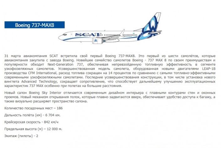 Авиакомпания SCAT начала полеты Boeing 737 MAX 8 в апреле 2018 года. В пресс-службе сообщили, что воздушное судно эксплуатируется в штатном режиме и замечаний по его работе не наблюдается.