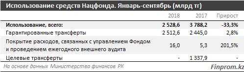 Из совокупной суммы использованных средств 2,51 триллиона тенге (99,4 процента) были направлены на гарантированные трансферты. Управление Фондом по итогам 9 месяцев обошлось в 16 миллиардов тенге против 5,3 миллиарда тенге годом ранее.