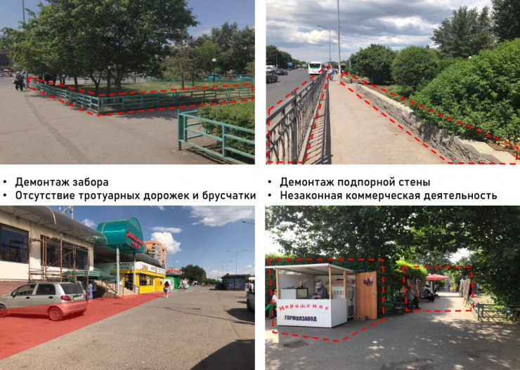 По просьбе жителей с наступлением тепла здесь демонтируют заборы и подпорные стены клумб. Также на месте появятся детская игровая площадка, теневые навесы, цветочные клумбы, упорядоченные коммерческие павильоны.